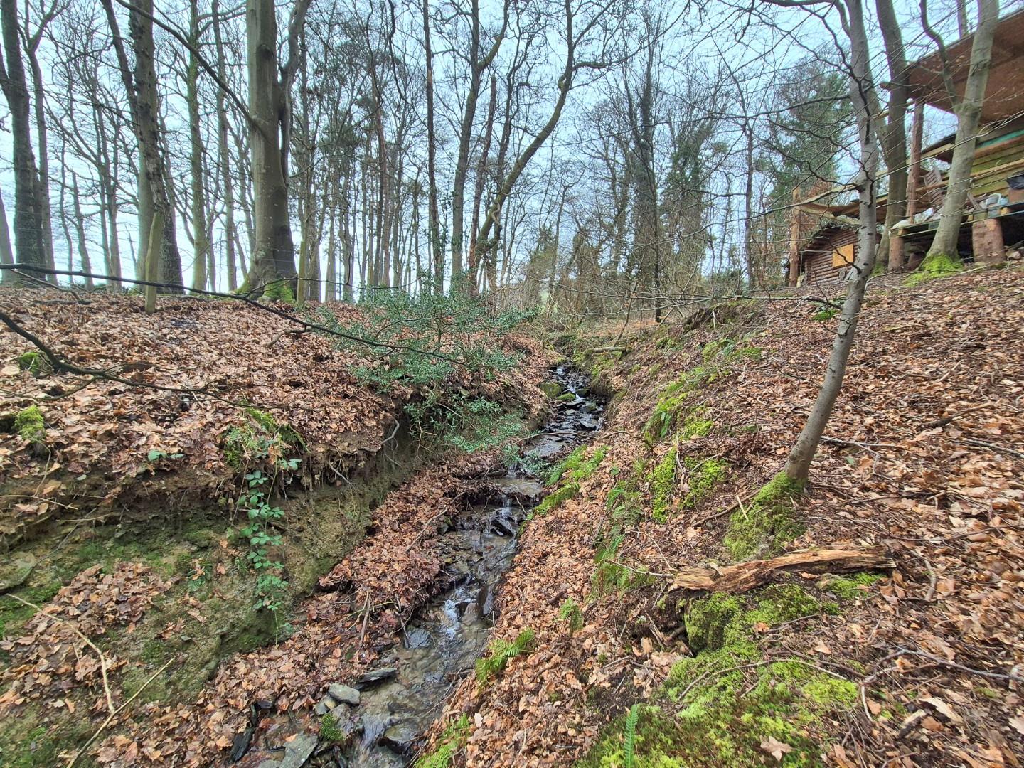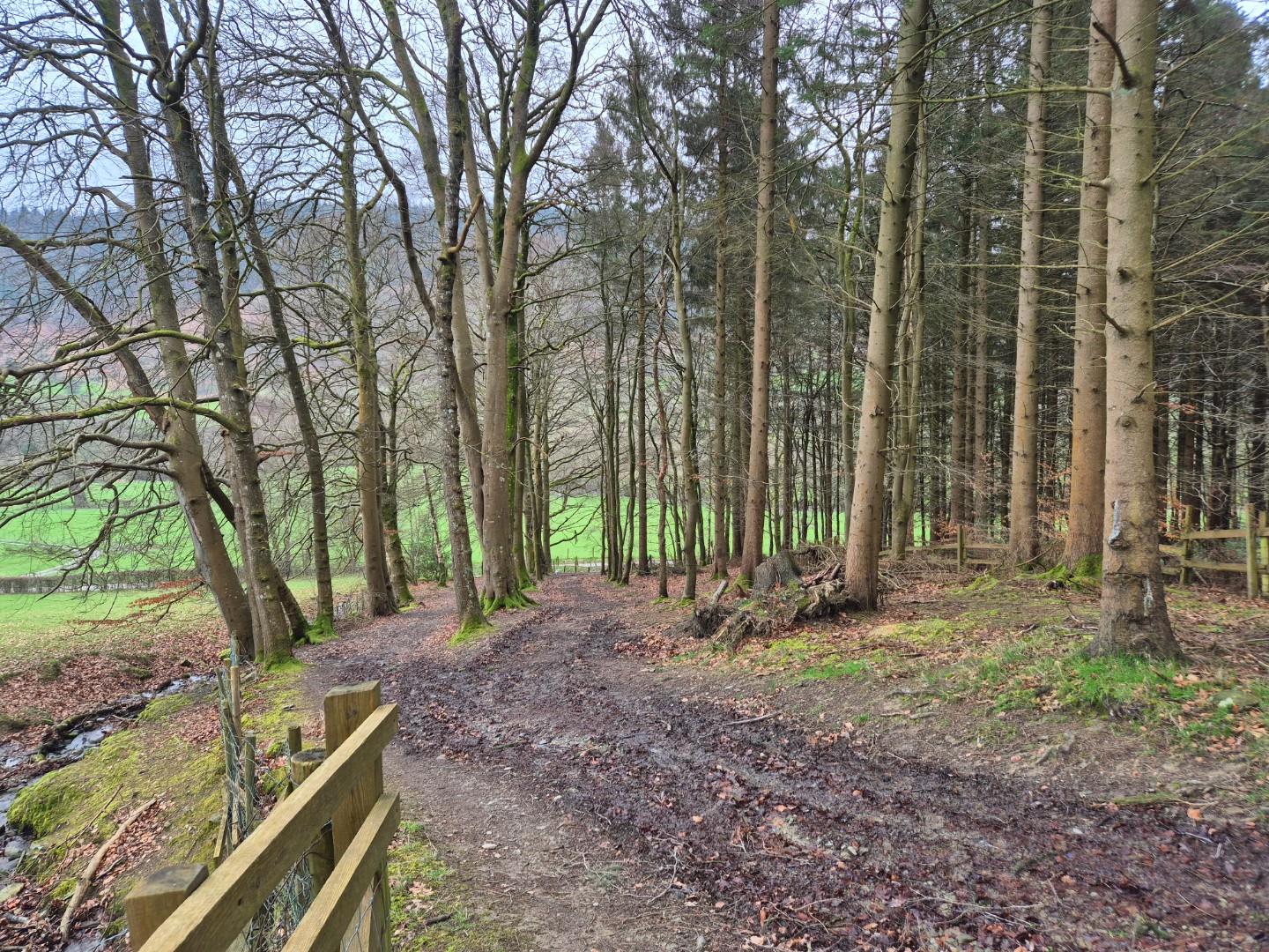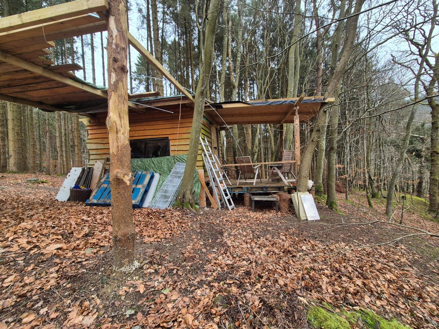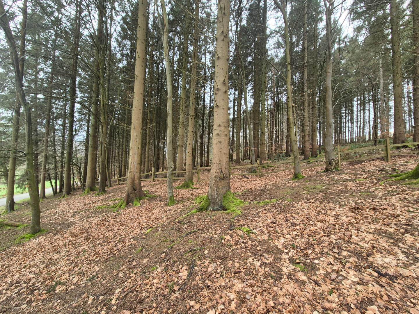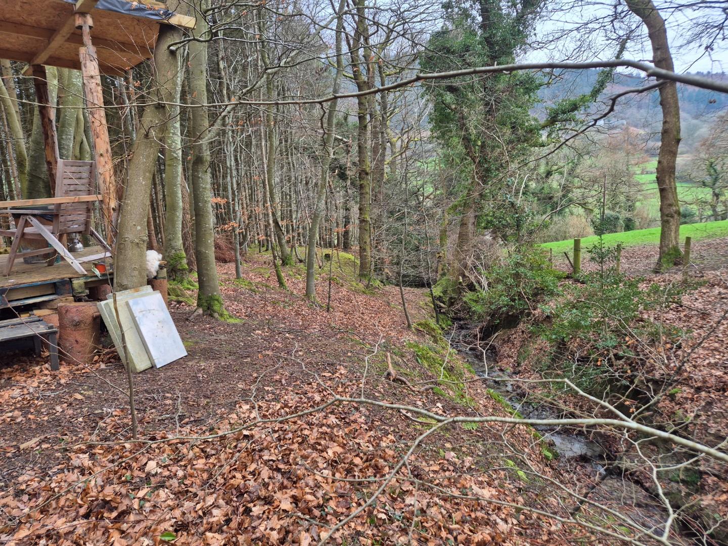 The pathways meander up through the large area of mature woodland of mainly Scots Pine and some beech trees which stand tall over an area of natural flora and fauna. The mountain stream extends up along the western boundary from which there are views towards the Pennant valley together with a large timber framed and panelled cabin with a raised veranda looking south. Beyond, there is a further log cabin.