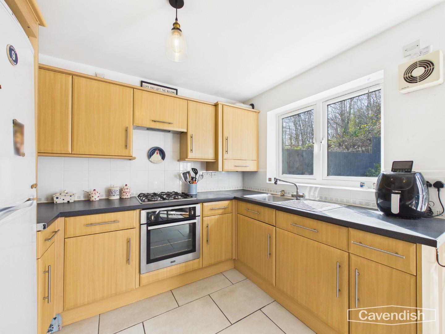 The kitchen is fitted with a range of beech-effect wall and base units with contrasting black worktops. Appliances include a gas cooker with hob and extractor above, with space for a fridge freezer and additional white goods. A stainless steel sink with mixer tap sits beneath a double-glazed window overlooking the rear garden. White tiled flooring runs throughout, complemented by tiled splashbacks and two ceiling light pendants. Double doors open directly onto the rear garden, creating a seamless indoor-outdoor connection. A further door leads to a useful under-stairs storage cupboard, ideal for pantry use.